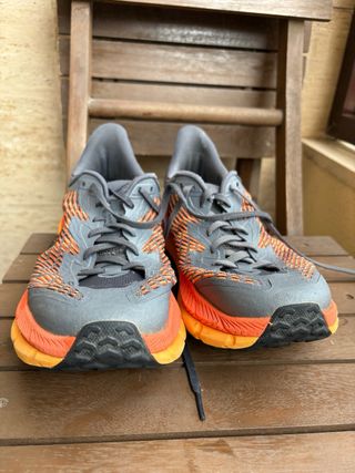 Zapatillas Hoka Mafate Speed 4 en color gris y naranja. Diseñadas para trail running. Súper cómodas - Parte superior de malla. - Suela de goma para tracción. - Sistema de lazada rápida. Usadas pero sin rotos. A la suela todavia le quedan kilometros.