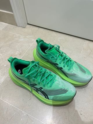 Zapatillas Asics Megablast talla 44 en color verde ekiden. Solo la he usado dos veces. Es mi regalo de reyes y la vendo por quedarme pequeña. Aconsejo que la compre alguien que tenga talla 43 o 43,5 en zapatillas tipo novablast o nimbus.