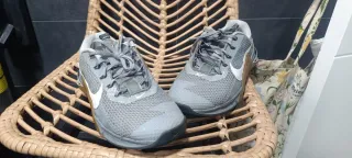 Zapatillas deportivas Nike Metcon, ideales para entrenamiento CrossFit. - Diseño en color gris con detalles blancos. - Parte superior de malla transpirable. - Suela robusta para mayor estabilidad.