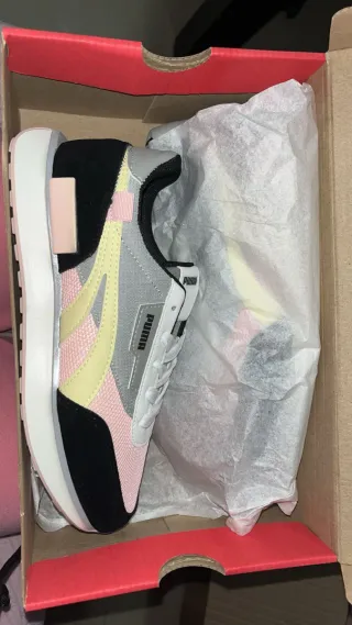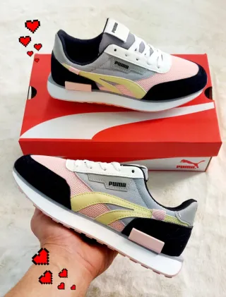 Zapatillas deportivas Puma con un diseño moderno y llamativo. - Combinación de colores gris, rosa y amarillo. - Detalle de la marca Puma en el lateral. - Suela blanca y gruesa.