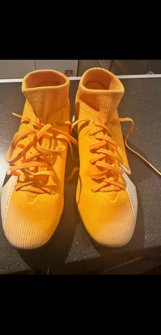 Zapatillas de tacos Puma en llamativos tonos naranja y blanco. Perfectas para destacar en el campo. - Diseño deportivo. - Detalles de rayas blancas.Como nuevas solo utilizadas 2 veces