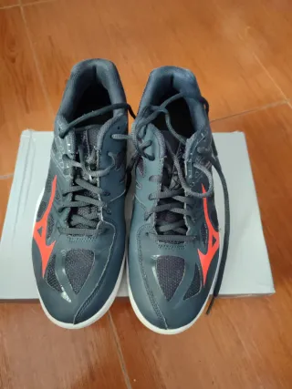 Zapatillas deportivas Mizuno con un diseño moderno y llamativo. - Combinación de colores gris y naranja. - Materiales de calidad para mayor durabilidad.