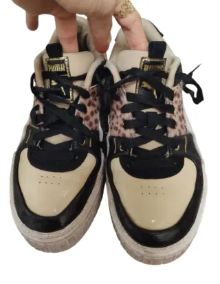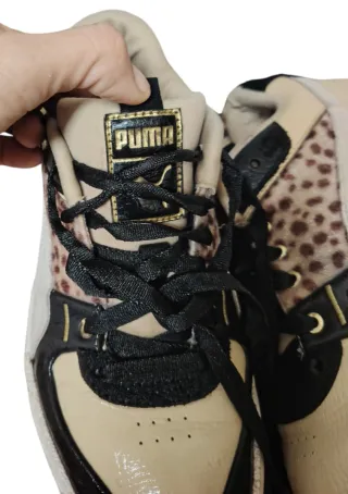 Zapatillas Puma con un llamativo estampado animal print. - Diseño con detalles en animal print. - Combinación de colores beige y marrón.