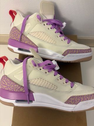 Zapatillas Jordan Spizike Low (GS) en talla 37.5 EUR. - Diseño en color crema con detalles en morado. - Cordones morados. - Suela de goma en color natural.