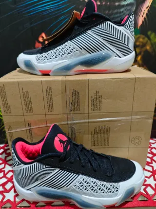Zapatillas Air Jordan XXXVIII LOW en color negro y rojo Nuevas sin estrenar Originales 💯 Caja original sin tapa Baloncesto - Diseño moderno con detalles geométricos. - Suela con tecnología Air-Sole. - Logotipo Jumpman en la lengüeta y el lateral.