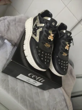 Zapatillas de la marca Cetti con un diseño moderno y detalles llamativos. - Adornadas con remaches plateados. - Detalles en color dorado. - Cierre con cordones. Usadas dos veces,me vienen pequeñas