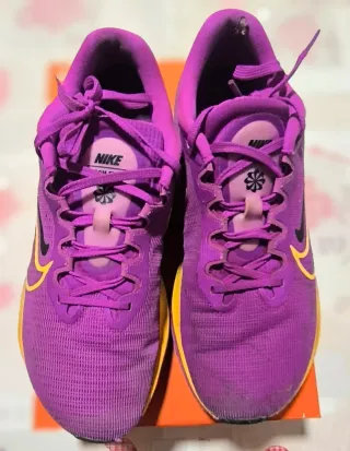 Zapatillas deportivas Nike ZoomX 5 en llamativos tonos morado y amarillo. Perfectas para tus entrenamientos. - Diseño moderno y deportivo. - Cordones para un ajuste seguro. - Suela con detalles en amarillo.