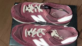 Zapatillas de la marca New Balance en tonos grises y burdeos. Perfectas para el día a día. - Diseño deportivo. - Cierre con cordones.