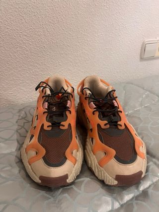 Zapatillas Adidas Adventure con un diseño moderno y llamativo. - Combinación de colores marrón y naranja. - Estilo deportivo y urbano.