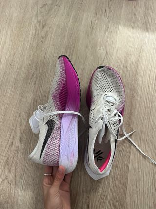 Zapatillas de running Nike Vaporfly en blanco y rosa. - Diseño de malla transpirable. - Detalles en color fucsia. - Cordones blancos.