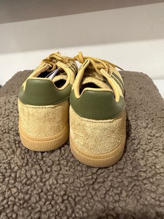 Zapatillas Adidas Spezial Handball en color amarillo y verde oliva. Un clásico para tu colección. - Parte superior de ante. - Detalle de las tres rayas. - Suela de goma.