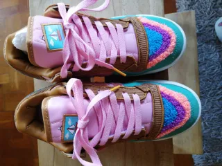Zapatillas Adidas Forum Low inspiradas en Los Simpsons. Un diseño único y llamativo. - Detalle de parche con un velero. - Combinación de colores vibrantes con texturas. - Cordones rosas. - Suela de goma.