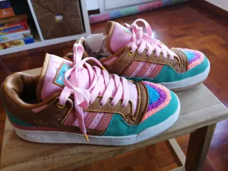 Auténtica zapatilla del grupo musical Locomia. Un diseño único y llamativo. - Acabado brillante con detalles multicolores. - Cierre con cordones.