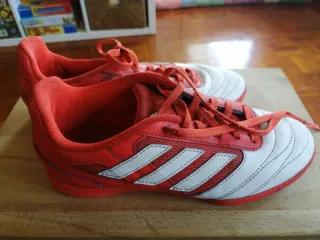 Zapatillas de fútbol sala Adidas en talla 38. - Combinación de colores rojo y blanco. - Diseño deportivo.