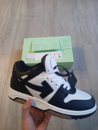 Zapatillas Off-White de diseño moderno. - Combinación de colores blanco y negro. - Detalle de flecha distintivo en el lateral.