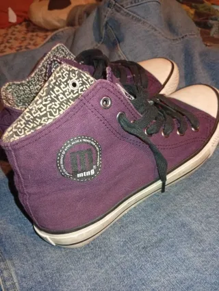 Zapatillas de tobillo, tipo allstars, suela plana, marca mustang de color lila. Me hacen daño, y estan nuevas. Marca mustang talla 39 - Suela de goma - Interior con estampado. - Cierre de cordones.