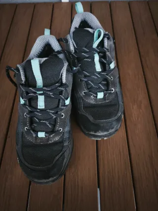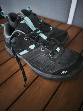 Zapatillas de senderismo Quechua en color negro y turquesa. Perfectas para tus rutas. - Diseño robusto y cómodo. - Cierre con cordones. - Suela adherente. Poco usadas. Precio actual en tienda 49'90€