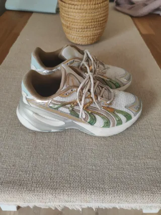 Zapatillas Puma con un diseño moderno y detalles en dorado y blanco. - Combinación de colores oro y blanco. - Estilo deportivo y llamativo.