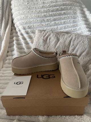 Zapatillas UGG de color beige, perfectas para estar cómodo en casa. - Diseño tipo mule. - Detalle de pespunte en la parte superior. - Suela gruesa y cómoda.