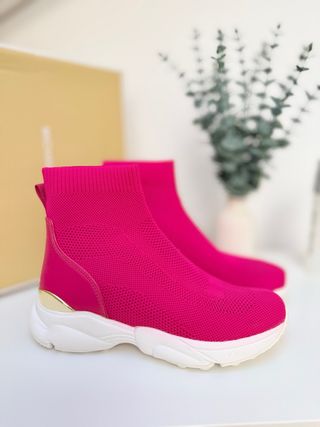 Zapatillas de la marca Michael Kors en llamativo color rosa con detalles dorados. - Diseño tipo botín. - Suela blanca de goma. - Tejido elástico para un ajuste cómodo.