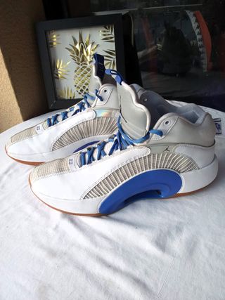 Zapatillas deportivas Nike Air Jordan 35. - Diseño moderno en blanco y azul. - Cordones azules. - Suela de goma. - Detalle de malla en los laterales.