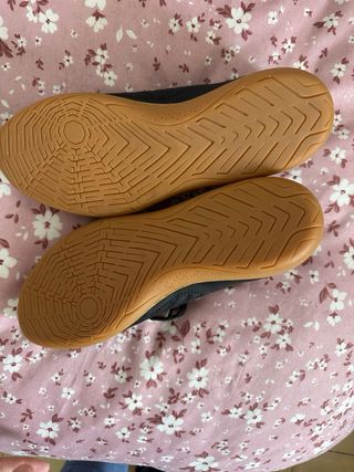 Zapatillas de fútbol sala con diseño inspirado en Messi. Talla 45 pero son justas. Yo calzo un 44 y me van bien. Poco uso - Color principal naranja con detalles amarillos. - Logo distintivo de Messi en el talón.