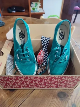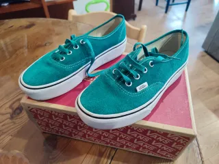 Zapatillas de ante en un llamativo color verde azulado. - Cierre de cordones. - Suela de goma blanca. - Detalle de costuras. Viene con unos cordones extra estilo SKA Blanco y negro Embalaje original Pegatina marca Vans Se han usado en dos ocasiones. Me van pequeñas.