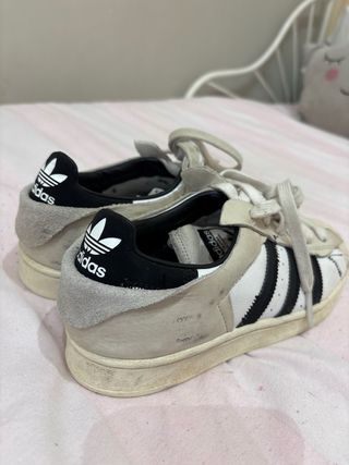 Zapatillas de la marca Adidas en color beige y negro. Un calzado cómodo y versátil. - Diseño moderno. - Detalle del logo de Adidas en la parte trasera.