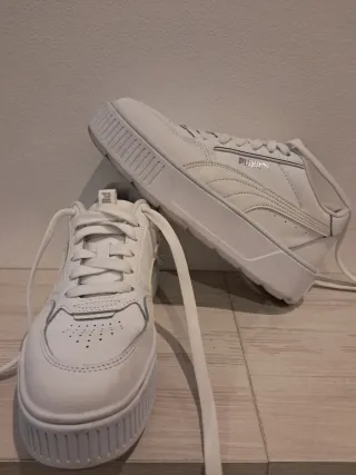 Zapatillas de plataforma Puma en color blanco. Karmen Revel Jr. - Diseño moderno y cómodo. - Detalle de logo plateado en el lateral. - Cordones blancos. - Suela gruesa. Muy poco uso, en perfecto estado