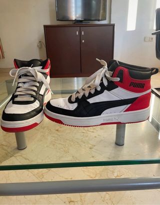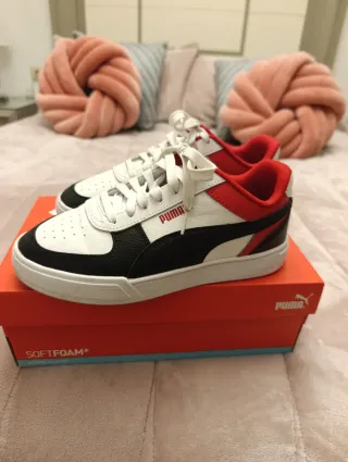 Zapatillas deportivas Puma con un diseño moderno y llamativo. Solo usadas una vez. Costaron 55 euros. - Combinación de colores blanco, negro y rojo. - Cierre con cordones. - Detalle del logo de Puma en el lateral.