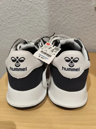 Zapatillas deportivas Hummel en talla 43. Combinan un diseño moderno con detalles en blanco. - Parte superior de tela azul. - Detalles laterales en blanco. - Cordones blancos. - Suela blanca.
