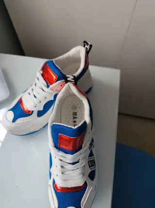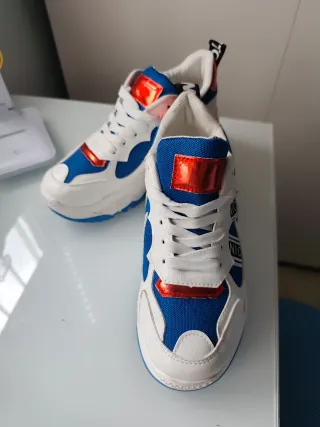 Solo un uso Zapatillas deportivas con un diseño moderno y llamativo. - Combinación de colores azul y blanco. - Detalles metálicos en rojo. - Cierre con cordones.
