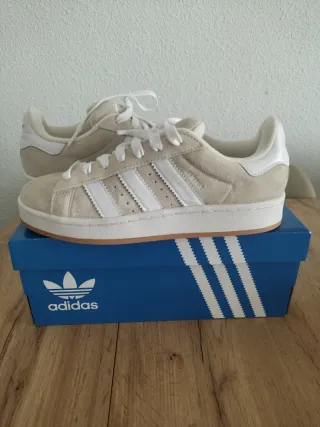 Zapatillas Adidas Campus en tonos beige y blanco. Totalmente nuevas y auténticas. Talla 41 y 1/3. - Diseño clásico de Adidas. - Material exterior de ante. - Detalle de las tres rayas blancas. - Suela de goma. - Cierre con cordones. #adidas#zapatillas#campus00s#campus#