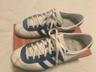 Zapatillas Adidas London de piel color blanco y azul en talla EU 44 2/3 (UK 10 , US 10 1/2). Excelente estado, muy poco uso. Uno de los modelos más emblemáticos y difíciles de conseguir de Adidas. Mod, Casuals.