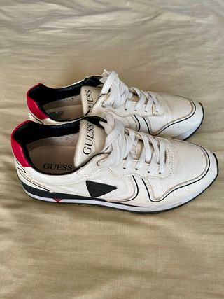 Zapatillas de la marca Guess en color blanco con detalles en rojo, Lacoste color azul y new balance . Se venden las tres parejas por 25€ Trato en mano en Guadalajara, no hago envíos - Diseño deportivo. - Cierre con cordones. - Logo de la marca en la lengüeta.