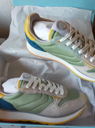 Zapatillas de la marca Stradivarius en talla 38. Combinan tonos verdes y blancos con un diseño moderno. - Detalle de cordones con rayas verdes. - Logo de la marca en la lengüeta.