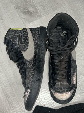 Zapatillas altas Nike Blazer con un diseño llamativo. - Parte superior con patrón de telaraña. - Swoosh lateral en tono grisáceo. - Detalles plateados en la puntera y el talón. - Cierre con cordones negros.