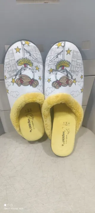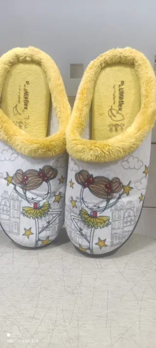 Adorables zapatillas de casa con un diseño de bailarinas y un suave forro - Detalle de bailarinas con tutú amarillo. - Estrellas y nubes decorativas. - Ribete interior de pelo sintético amarillo -Plantillas extraíbles para poder lavarlas No hago envío inferior a 20€... SÍ agrupo artículos en un mismo envío.