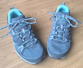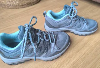Zapatillas de trekking Columbia en tonos grises con detalles en azul turquesa. Perfectas para tus aventuras al aire libre. Unisex. Usado 1 ocasión. - Impermeables. - Diseño deportivo y funcional. - Cordones a juego con el diseño.
