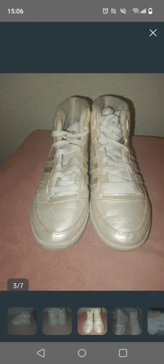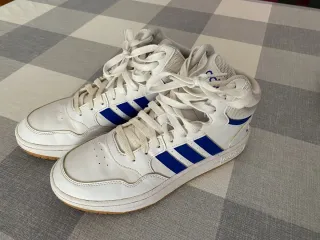 Zapatillas de caña alta de la marca Adidas. - Diseño deportivo en blanco con detalles en azul. - Cierre con cordones blancos. - Suela de goma. - En muy buen estado, apenas tienen uso