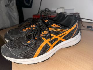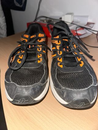 Zapatillas deportivas Asics con un diseño moderno y llamativo. - Combinación de colores negro y naranja. - Materiales transpirables para mayor comodidad. - Suela blanca para un contraste elegante.