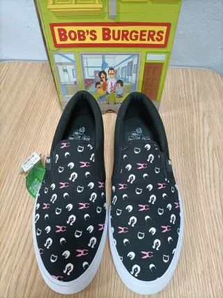 Zapatillas DC con estampado de Bob's Burgers. Talla 44,5 - Diseño slip-on. - Estampado de personajes y elementos de la serie. - Combinación de colores negro y rosa. NUEVAS A ESTRENAR