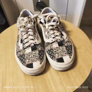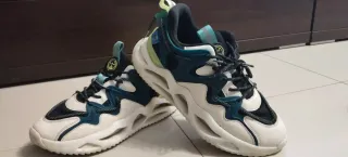 Zapatillas deportivas con un diseño moderno y llamativo. - Combinación de blanco,negro y detalles dorados. - Estilo deportivo y casual. - Es un 43 pequeño. Más bien un 42 diría yo