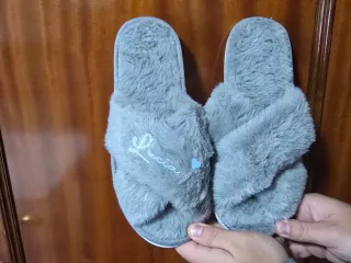 Comodísimas zapatillas de pelo gris con un diseño cruzado. Talla 39-40 - Acabado suave y mullido. - Detalle de corazón y nombre bordado en azul claro.
