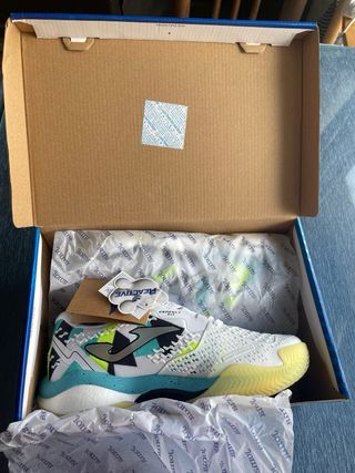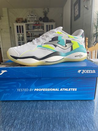 Zapatillas deportivas Joma en perfecto estado, a estrenar. - Diseño moderno con detalles en verde lima y turquesa. - Suela con tecnología Reactiveball. - Sistema Flexshield en la parte superior.