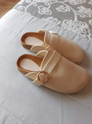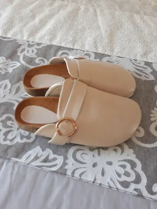 Zapatillas de casa para mujer con un diseño moderno y cómodo. Es de poli/piel con hebilla dorada. Cómoda y elegante. Número 38. Precio == 12 euros - Acabado liso. - Detalle de hebilla dorada.