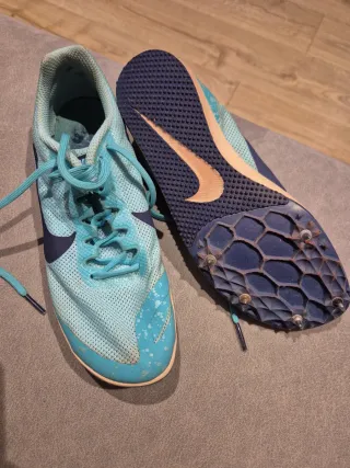 Zapatillas de atletismo Nike en color azul y turquesa. Perfectas para la pista. - Diseño ligero y transpirable. - Suela con tacos para máximo agarre. - Cierre con cordones.