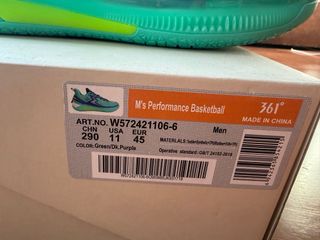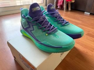 Zapatillas de baloncesto 361 Degrees, modelo Big3 V, inspiradas en Nikola Jokic. Combinan tonos verdes y morados vibrantes. - Diseño con detalles de rayo. - Cordones morados. - Suela de goma. - Parte superior de malla transpirable.