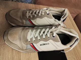 Zapatillas deportivas de la marca NICOBAR en tonos beige y blanco. Perfectas para el día a día. - Diseño casual y moderno. - Cierre con cordones. - Detalles de color en los laterales.
