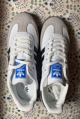 Zapatillas Adidas Samba XLG con un diseño clásico y moderno.120 - Parte superior de cuero blanco. - Detalle de las tres rayas negras. - Suela de goma marrón. - Detalle de la marca SAMBA en dorado. Nuevas. En su caja. Precio negociable.